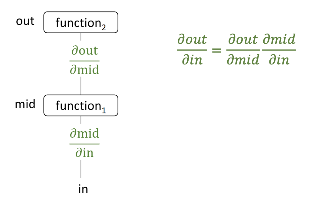 - 연쇄 법칙(chain rule)을 적용하면, 그래디언트는 다음과 같이 계산된다: