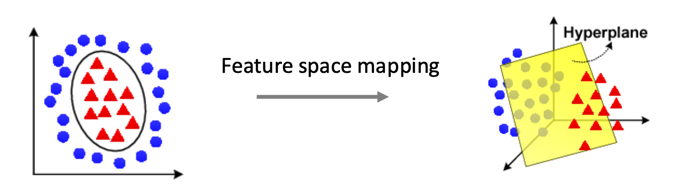- 변환된 특성 공간에서는, 결정 경계가 초평면(hyperplane) 이 된다.