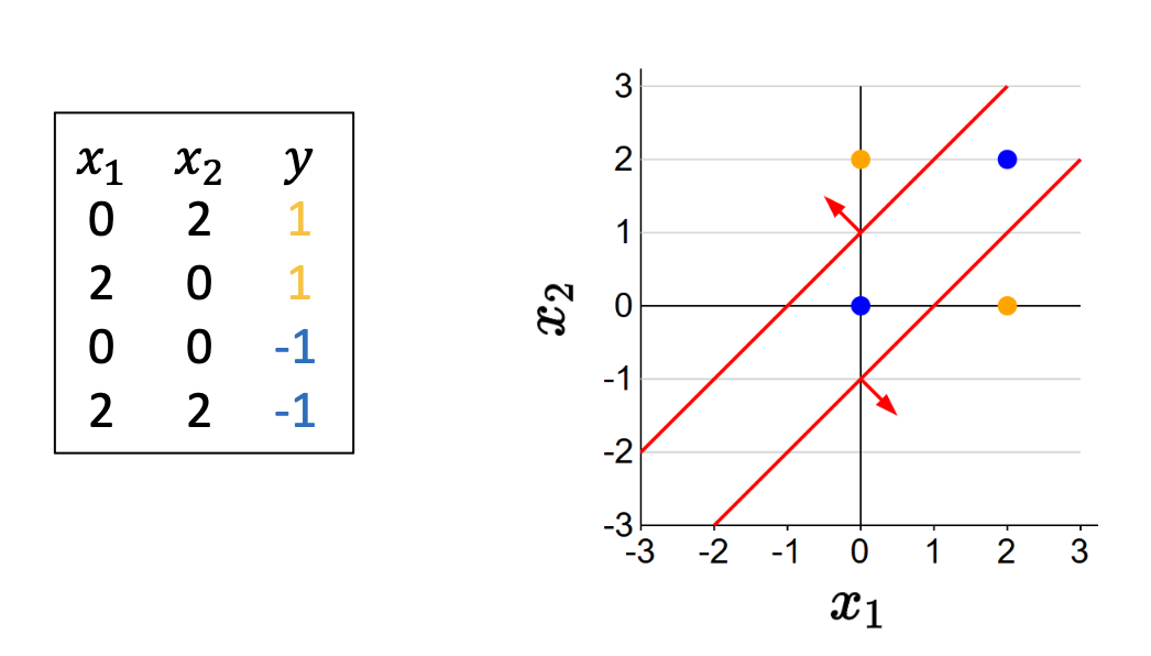 \[(x_1 - 1)^2 + (x_2 - 1)^2 = 2\]가 되어, 원래의 공간에서는 원의 형태가 결정 경계가 된다.