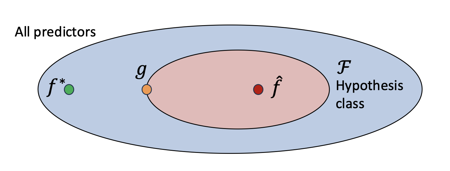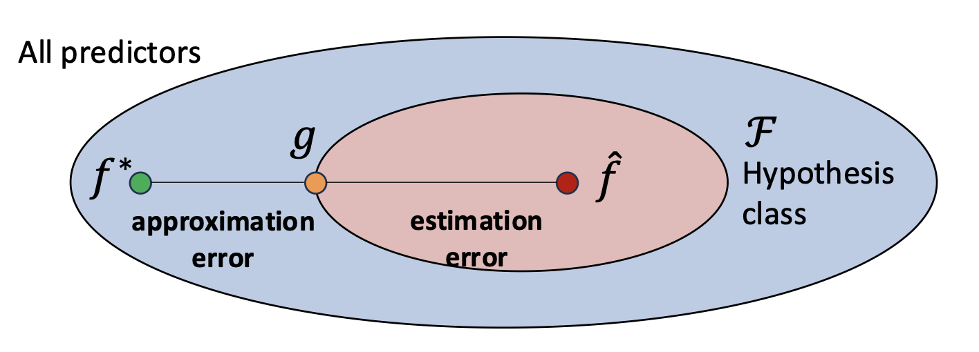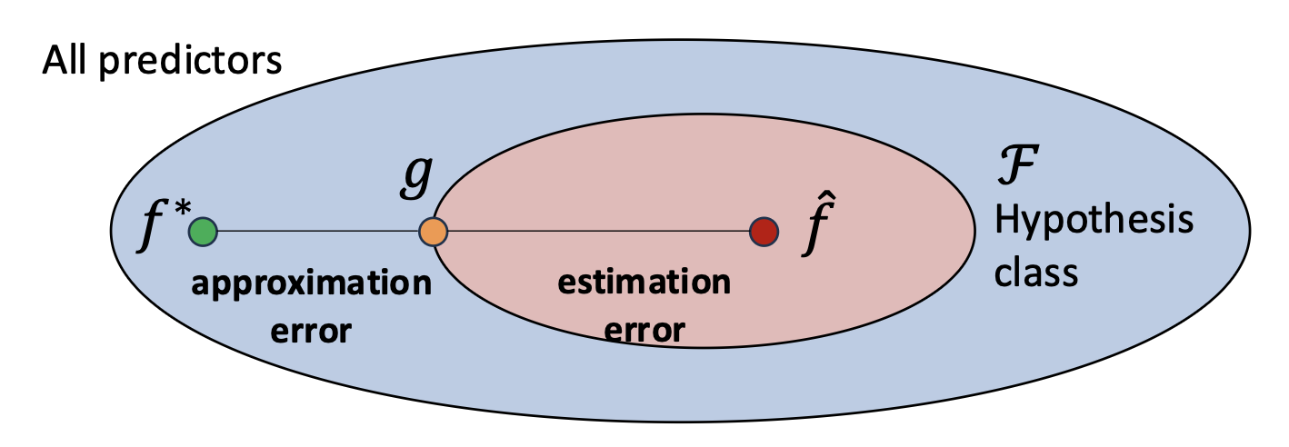 - 근사 오차(Approximation error) 는 가설 클래스(hypothesis class)의 한계(limitations) 로부터 발생한다.