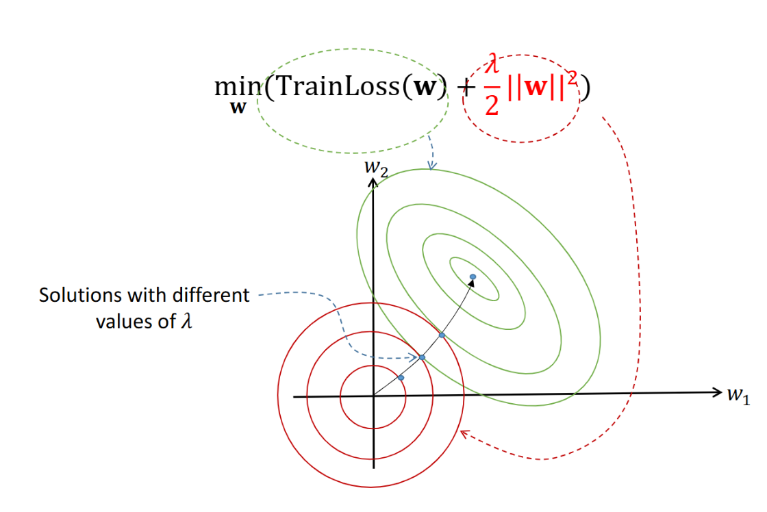 \[\min_{\mathbf{w}}\; TrainLoss(\mathbf{w}) + \frac{\lambda}{2}\|\mathbf{w}\|^2\]$\lambda$: 정규화 강도를 조절하는 하이퍼파라미터