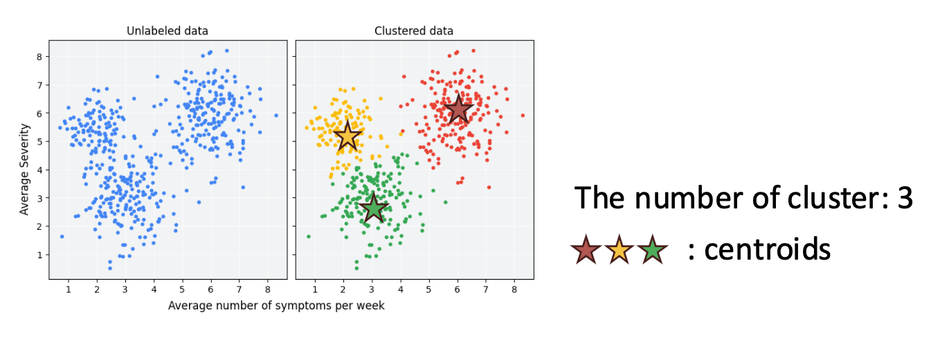 중심점(centroid) $\mu_k$ 는 클러스터 $k$의 대표 벡터(representative vector) 이다.