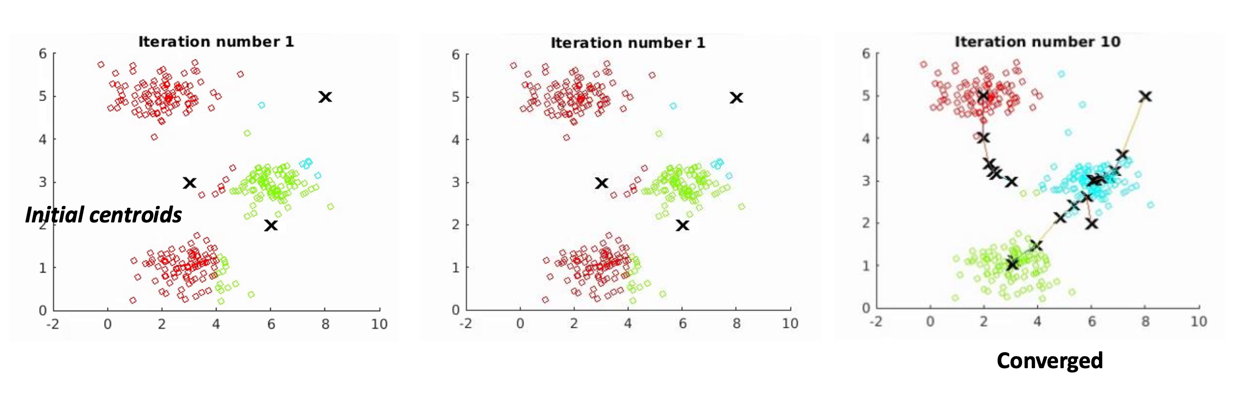 - 무작위로 중심점(centroids) $\mu = [\mu_1, \dots, \mu_K]$ 를 초기화한다.