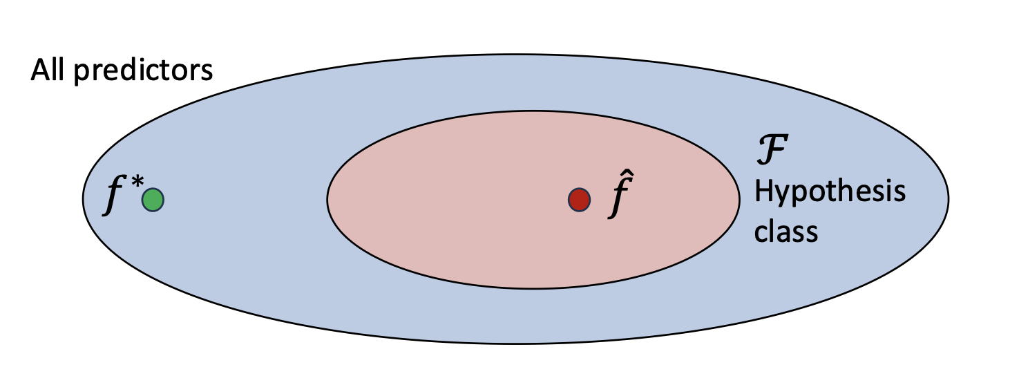 - 대신, 가설 클래스(hypothesis class) $\mathcal{F}$ 를 정의하여, 공간을 관리 가능한 모델 집합으로 제한한다.