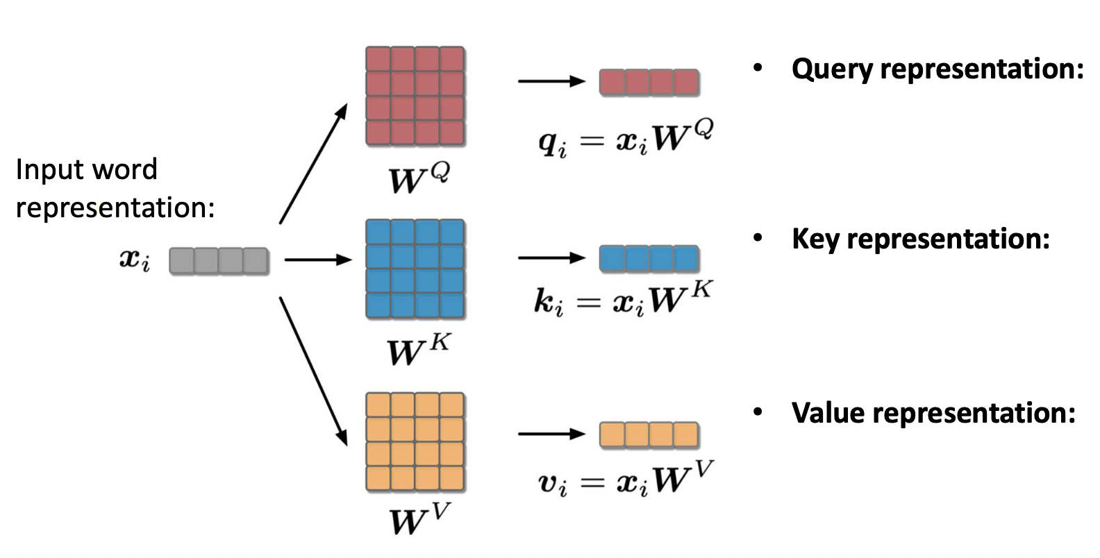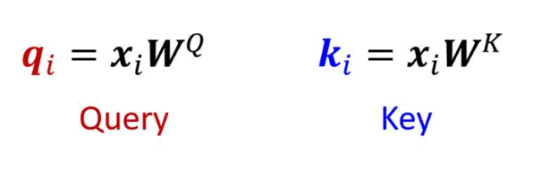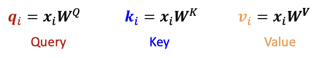 각 입력 단어 $x_i$ 에 대해 $q_i$, $k_i$, $v_i$ 를 계산한다.