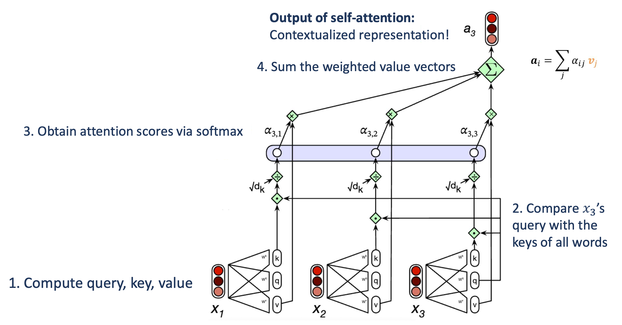 \(\alpha_{3,j} = \text{Softmax}\left(\frac{q_3 \cdot k_j}{\sqrt{d_k}}\right)\)
