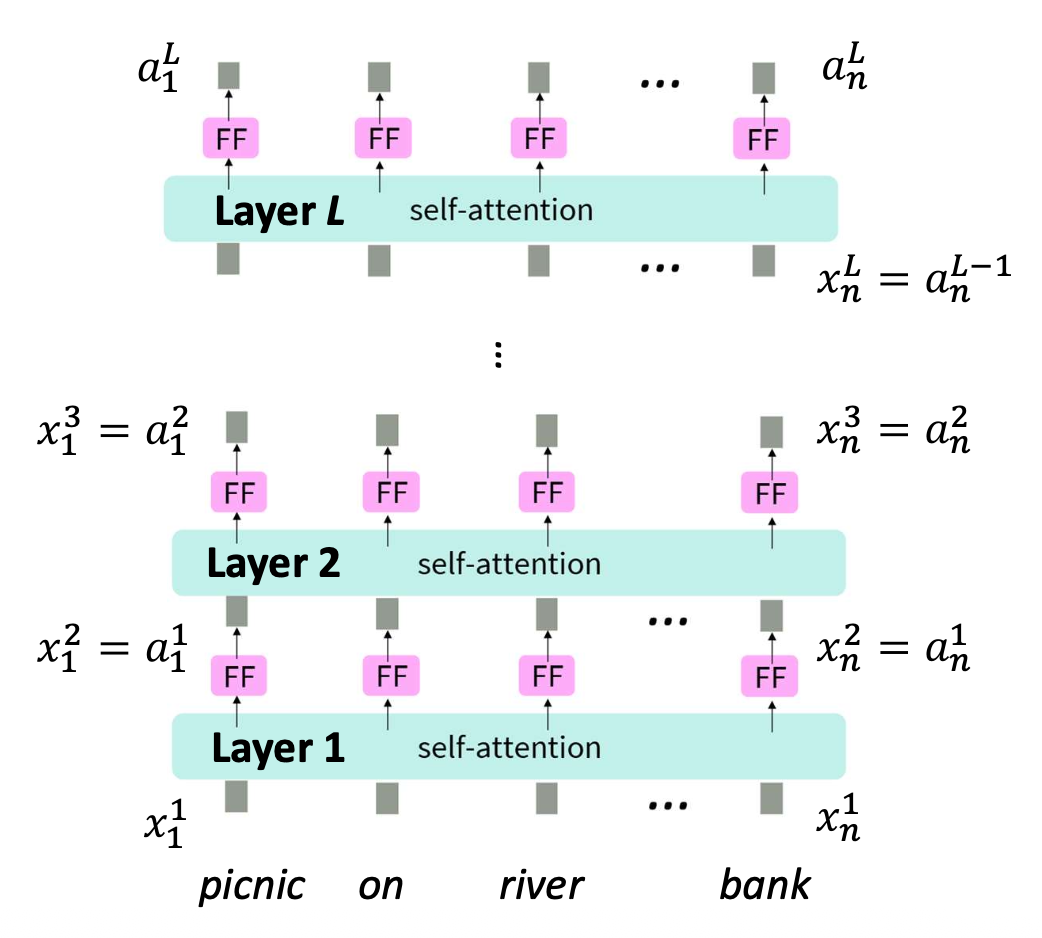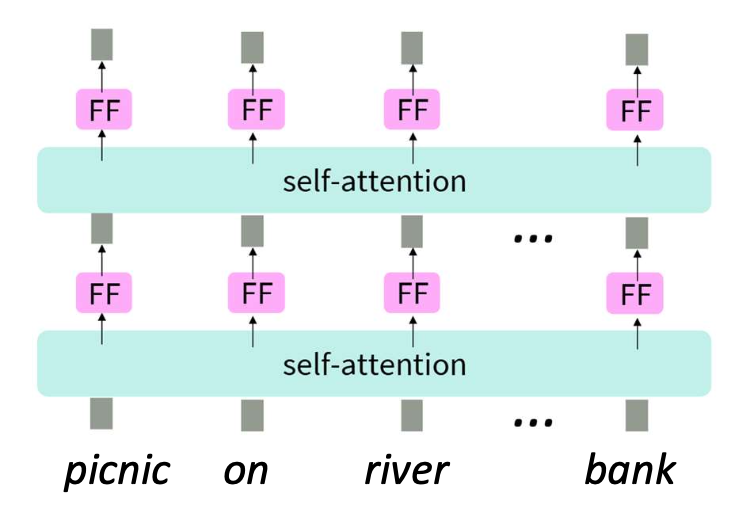 셀프-어텐션(self-attention)과 피드포워드(FF, feed-forward) 층을 반복적으로 적용한다.