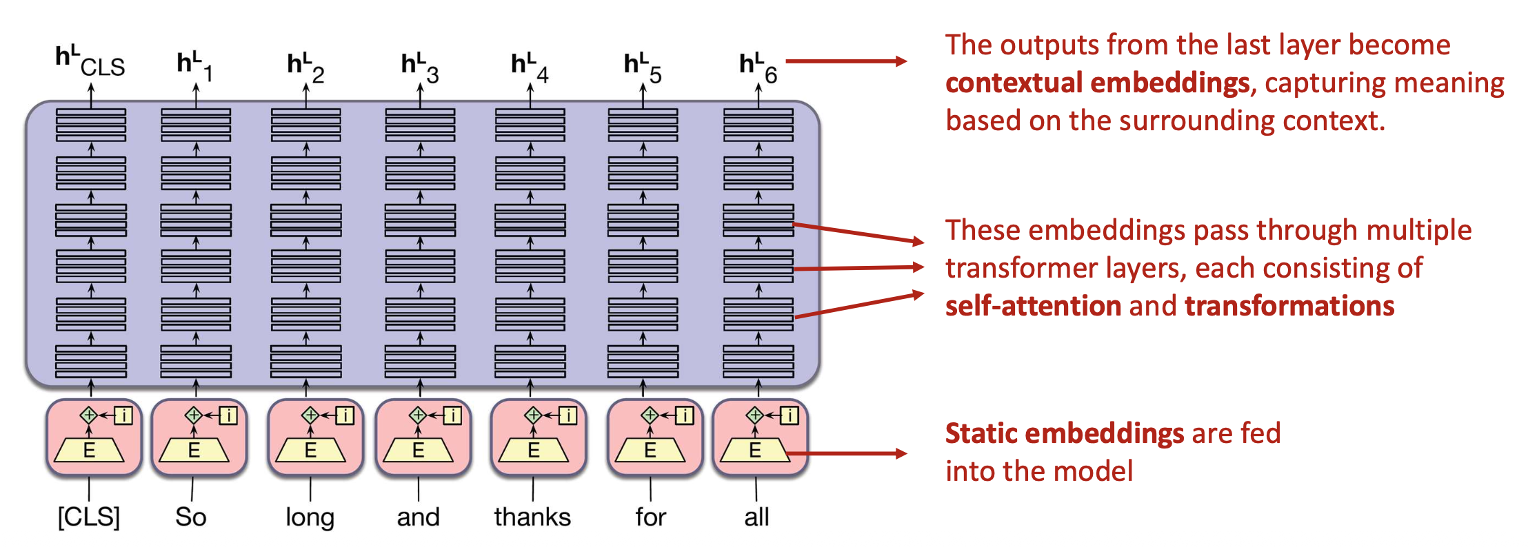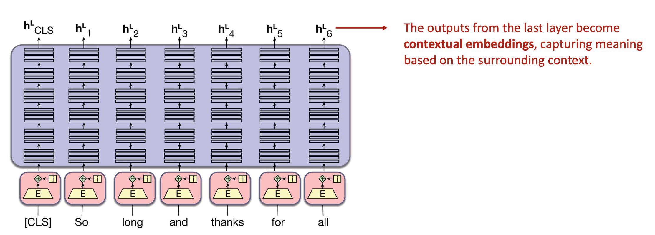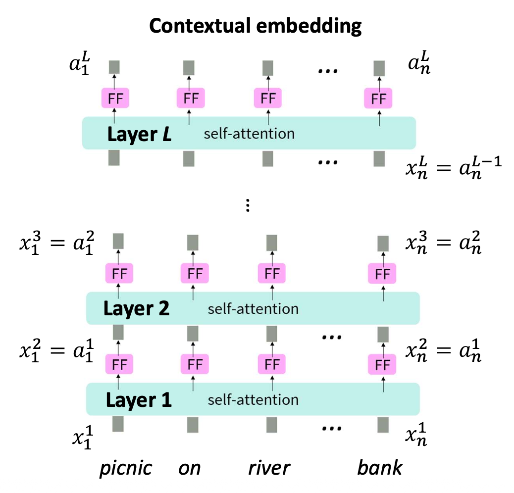 - 최종 출력은 문맥적 표현(contextual representations) 으로서