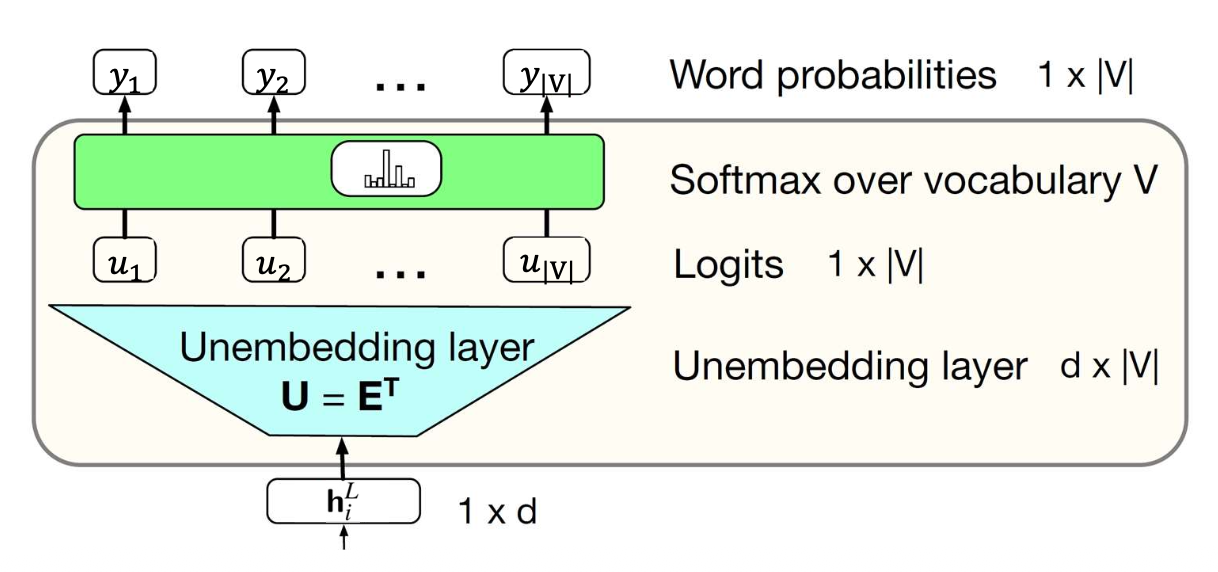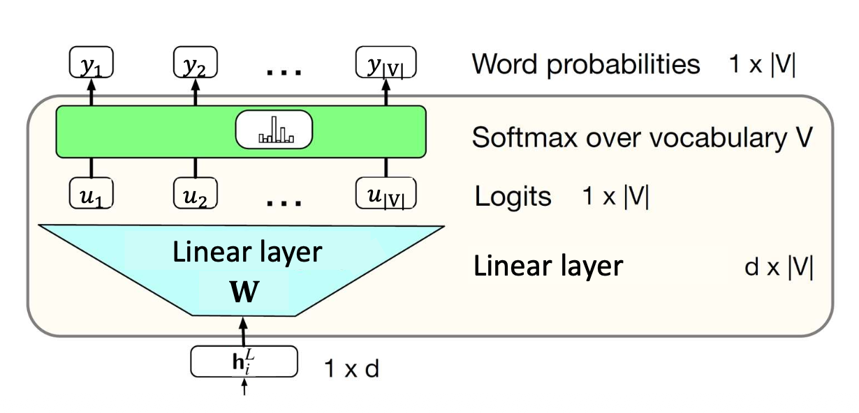 \[\mathbf{u} = h_i^L \mathbf{E}^\top, \qquad \mathbf{y} = \text{softmax}(\mathbf{u})\]