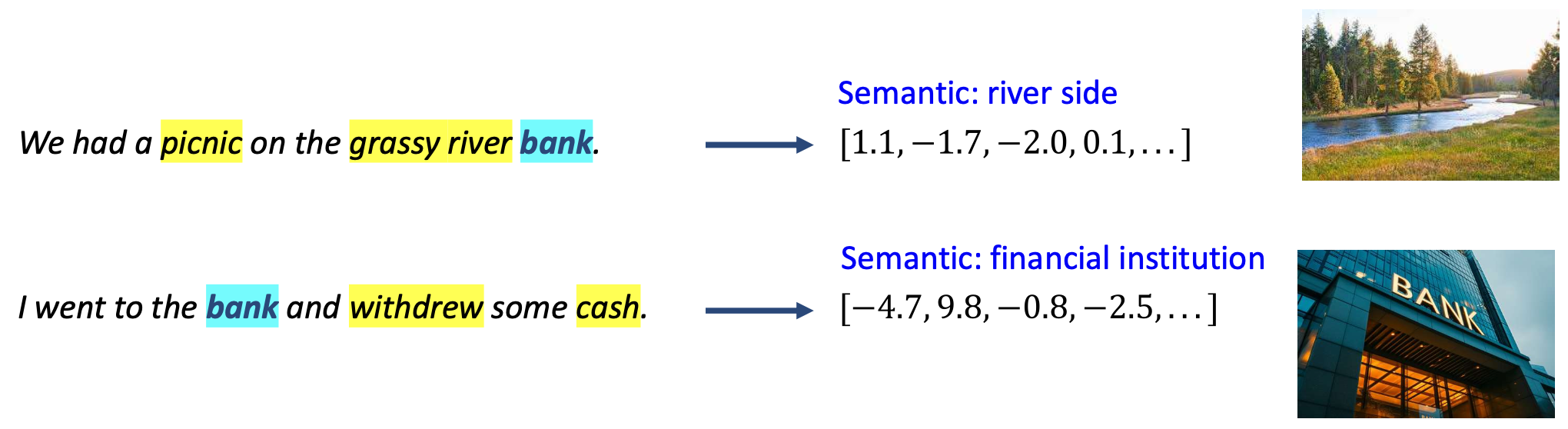 - 각 단어(예: picnic, on, river, bank)에 대해