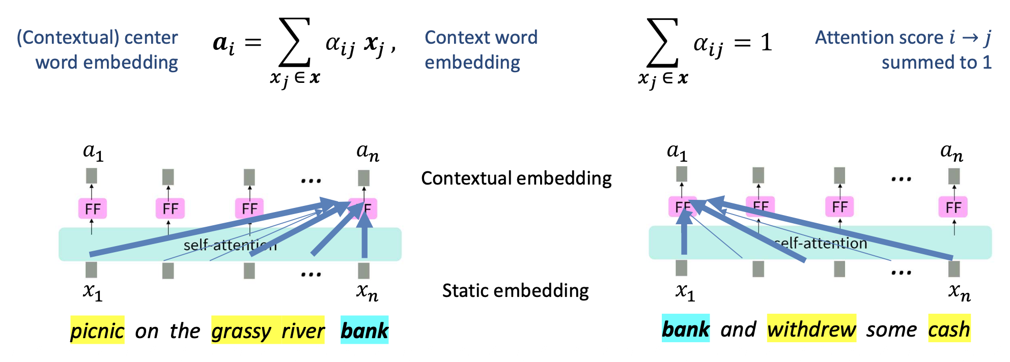 - 목표 단어의 임베딩을 문맥 임베딩들의 가중합(weighted sum) 으로 도출한다.