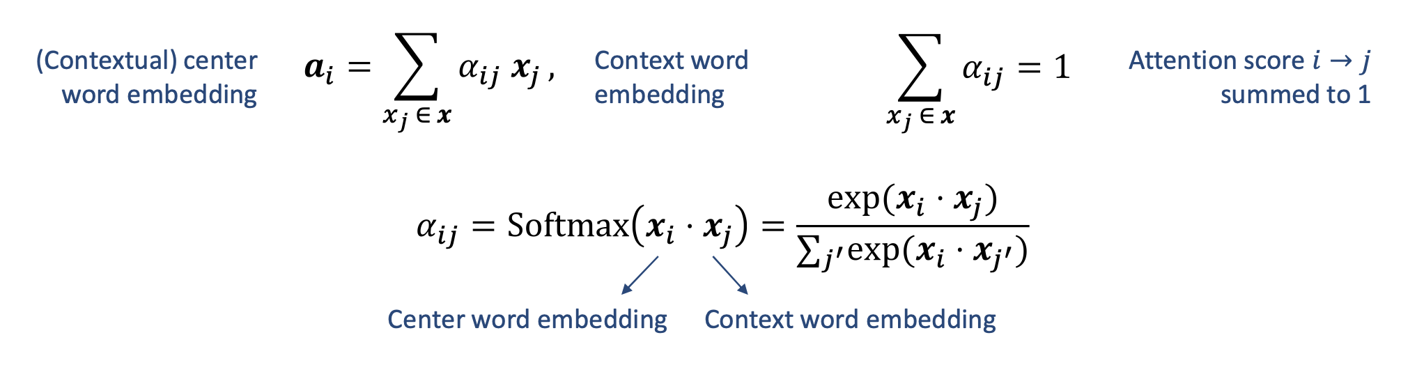 - $\alpha_{ij}$ : 단어 $i$가 단어 $j$에 주는 어텐션 점수(attention score) — 합이 1이 되도록 정규화됨