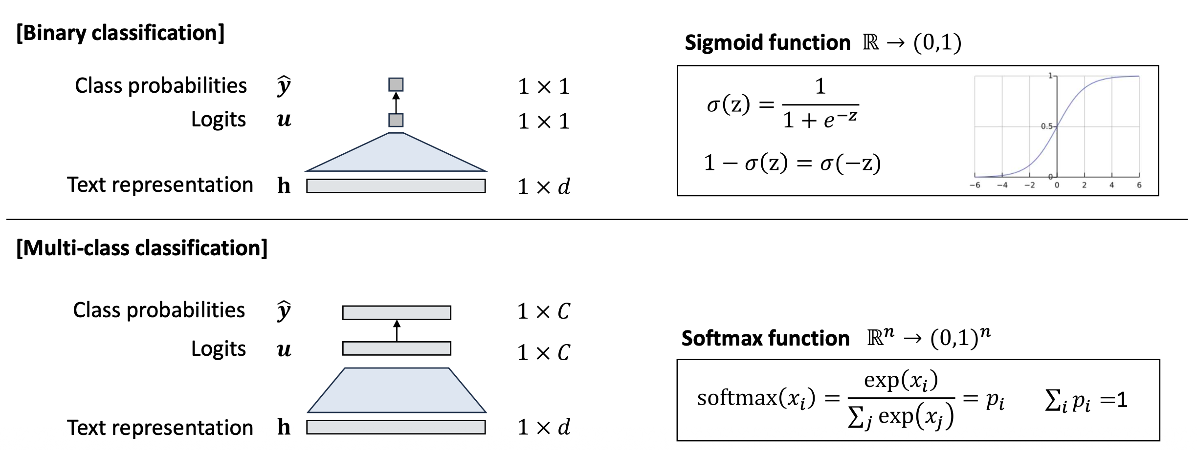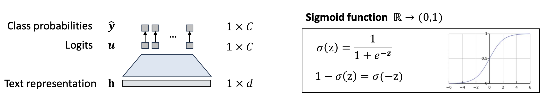 \[p_1 = \frac{e^{u_1}}{e^{u_0} + e^{u_1}} = \frac{1}{1 + e^{u_0 - u_1}} = \sigma(u_1 - u_0)\] \[p_0 = \underbrace{\frac{e^{u_0}}{e^{u_0} + e^{u_1}}}_{\text{Softmax}} = \underbrace{\sigma(u_0 - u_1)}_{\text{Sigmoid}} = 1 - p_1\]- 두 개의 로짓에 대한 소프트맥스는 로짓 차이 $(u_1 - u_0)$ 에 대한 시그모이드와 동일하다.